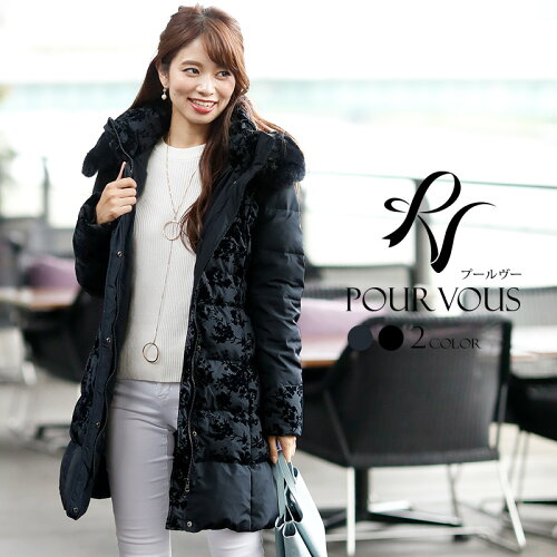 ------------------------------------------------------------ ドレッシーな雰囲気醸し出す上品なフロッキー刺繍がポイントのダウンコート。