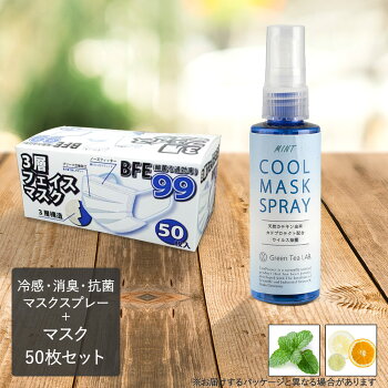3層フェイスマスク 50枚入り クールマスクスプレーセット | マスクスプレー 冷感 スプレー 予防 クール ひんやり 日本製 ウィルス対策 抗菌 消臭 ウイルス対策 不織布マスク 不織布 プリーツ 使い捨てマスク 大人用 まとめ買い 防災用品 防災セット 台風 備え 備蓄