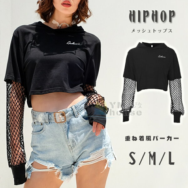 即納 メッシュトップス レディース ダンス衣装 送料無料 ヒップホップ 袖 パーカー 長袖 トップス ショート丈 重ね着風 ブラック ダンス衣装 HIPHOP コスチューム ヒップホップ 即納 送料無料 レディーストップス ダンス衣装 ヒップホップ 網 2